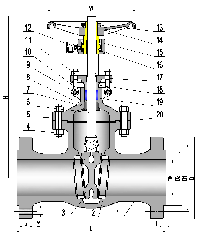 The gate is controlled by the stem, which passes through the bonnet and is connected to the handwheel or actuator for operation. The stem is sealed by packing within the bonnet to prevent leakage. The valve includes flanges for connection to piping systems.